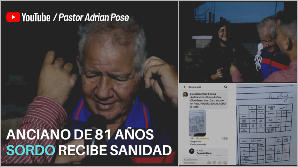Su hija cristiana, Nancy Martínez, le había previamente enseñado a su padre vídeos de testimonios de milagros realizados mediante el hombre de Dios. Se atrevió en fe a traerlo. Cuando el Pastor Adrian Pose impone su mano en su oído y declara sanidad, de pronto comenzó a escuchar perfectamente.